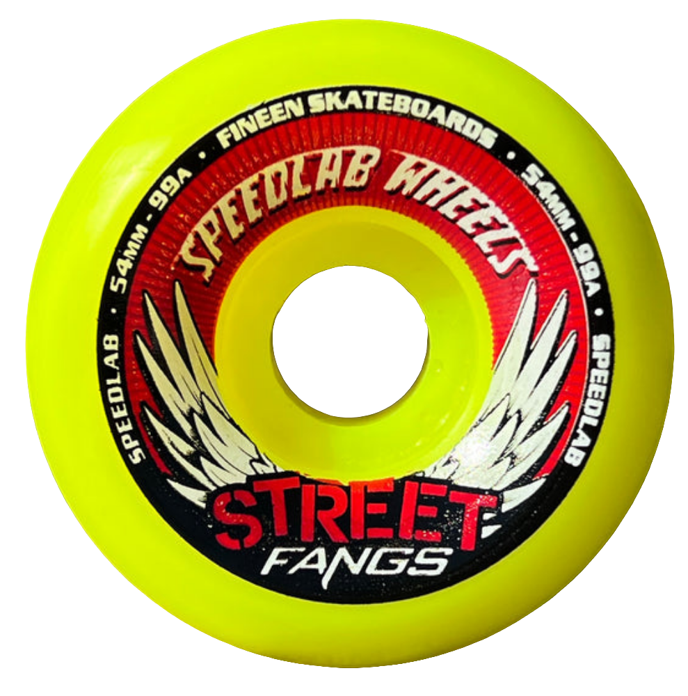 Street Fangs 3.0' by Speedlab Wheels. This collab wheel with Fineen Skateboards is the 3rd version of the Street Fangs. These 54mm wheels are slim & light the 99A durometer is great for street & transition, providing control and softer landings on rough terrain. The Street Fangs have rounded conical cuts on each side to provide a highly functional profile & shape made from the best formulas in the world for ultimate speed & control. Artwork by Mike Pressley.